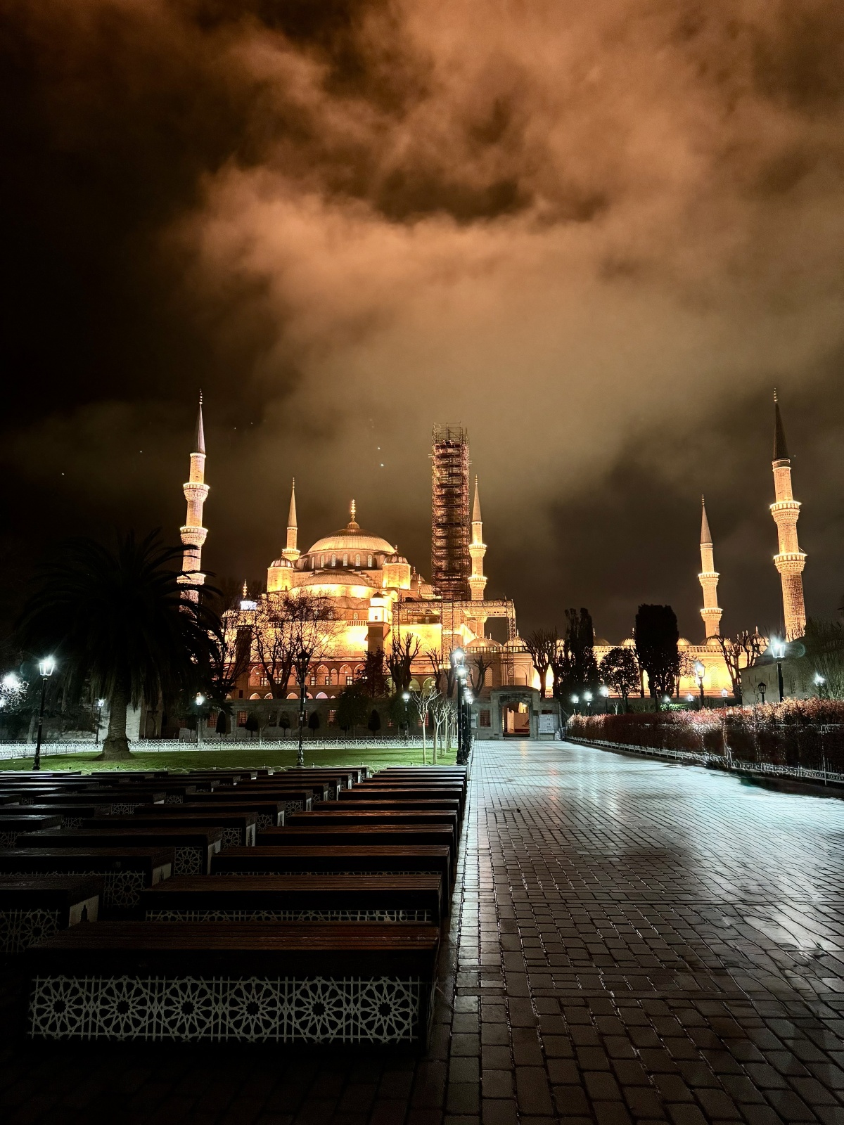 Standing before the magnificent Blue Mosque at night was breathtaking. The six minarets piercing the sky, illuminated in golden light against dramatic clouds, created a scene straight from Ottoman glory. This architectural masterpiece, completed in 1616, remains one of Istanbul's most iconic landmarks and a testament to Islamic artistry.