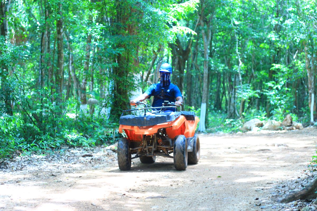 Racing through the muddy jungle trails on an ATV at The Jungle Kingdom! This incredible adventure was part of our $65 package that also included cenote swimming, ziplining, and a delicious meal. The ATV ride took us deep into the jungle on exciting terrain - definitely an adrenaline-pumping experience!